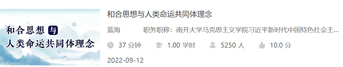 近日,由3044永利集团官网教师蓝海主讲的《和合思想与人类命运共同体理念》课程经由公司组织申报、上级部门遴选,成功入围中国干部网络公司开设的“文史撷英”中华优秀传统文化精品课程专栏目录并线上登录。登录至今,获得5200多人次学习点击量。